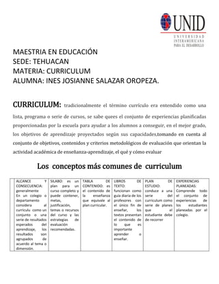 Este documento presenta un resumen sobre el término "currículum" en 3 oraciones. Explica que tradicionalmente el currículum se entendía como una lista de cursos, pero que en realidad es el conjunto de experiencias planificadas por la escuela para ayudar a los estudiantes a lograr objetivos de aprendizaje. Luego, define conceptos relacionados como alcance y silabo, tabla de contenido, plan de estudio y plan de experiencias planeadas. El documento concluye explicando brevemente cada uno de estos conceptos.