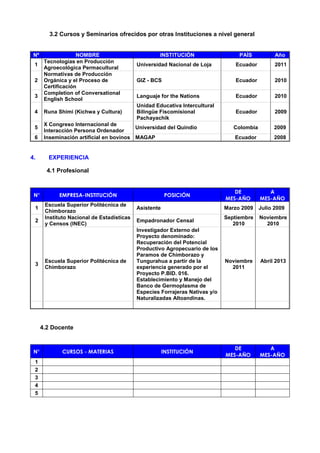 Este documento presenta el currículum vitae de Santiago Fahureguy Jiménez, un ingeniero zootecnista egresado de la Escuela Superior Politécnica de Chimborazo en Ecuador. Ha trabajado como asistente e investigador en dicha institución y realizado empadronamientos censales para el INEC. También se ha desempeñado como capacitador en temas agropecuarios y completó una maestría en agricultura sostenible. Habla e inglés a nivel intermedio y ha publicado artículos en conferencias internacional