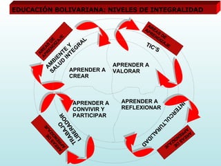 El documento describe el Sistema Educativo Bolivariano de Venezuela. Se basa en los ideales de libertad e igualdad de pensadores venezolanos como Simón Rodríguez, Simón Bolívar y Ezequiel Zamora. El sistema se organiza en subsistemas educativos como la educación primaria y secundaria. Su currículo se orienta por principios como la unidad, flexibilidad e interculturalidad y busca formar estudiantes de manera integral en áreas como ambiente y salud, tecnología e interculturalidad.