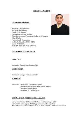 El documento presenta el currículum vitae de Darwin Hernán León Ibarra, un trabajador social ecuatoriano de 26 años. Incluye información personal, educativa, experiencia laboral en diversas instituciones en el área de trabajo social, y referencias personales.