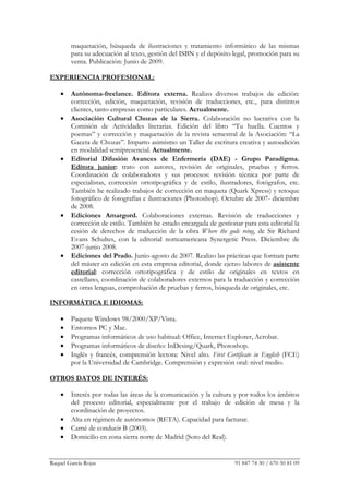 Este documento presenta el currículum y experiencia profesional de Raquel García Rojas. Ella tiene un Máster en edición impartido por la Universidad de Salamanca y es licenciada en Teoría de la Literatura. Tiene experiencia en edición, corrección, maquetación y autopublicación de libros. Actualmente trabaja como editora freelance y ha trabajado para varias editoriales.