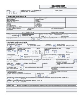 Este documento es una hoja de vida de Edwin Alonso Molina Muñoz para solicitar un empleo como contratista de obra civil. Contiene información personal, educativa, laboral y de contacto. También incluye secciones sobre su situación familiar, experiencia laboral, referencias personales y autorización para verificar la información provista. El objetivo es proporcionar los antecedentes necesarios para evaluar su candidatura al puesto solicitado.