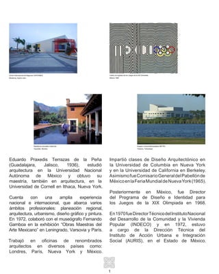 Eduardo Praxedis Terrazas de la Peña es un arquitecto, urbanista y diseñador gráfico mexicano nacido en 1936 que estudió arquitectura en la UNAM y obtuvo una maestría en la Universidad de Cornell. Ha trabajado en proyectos de arquitectura, urbanismo, planeación regional y diseño en México, Estados Unidos, Europa y África. Algunos de sus principales proyectos incluyen el diseño de los Juegos Olímpicos de 1968, el plan maestro de Dodoma (Tanzania) y el dise