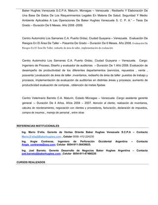 Joely B. Barreto V. solicita empleo como ingeniera industrial. Tiene como objetivo profesional pertenecer a un equipo de trabajo que le brinde oportunidades de crecimiento y ampliar sus conocimientos. Proporciona información personal y educativa, incluyendo su título universitario. Detalla experiencia laboral previa en centros veterinarios y automotrices en Venezuela. Incluye referencias, cursos realizados y competencias.