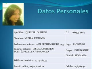Este documento presenta la información personal y académica de Yadira Estéfany Quiguiri Olmedo. Incluye detalles como su fecha y lugar de nacimiento, lugar de estudio actual, títulos obtenidos de primaria y secundaria, un curso recibido de 40 horas sobre bienestar animal, e información sobre sus habilidades en español e inglés. Finaliza con una declaración donde confirma la veracidad de la información provista.