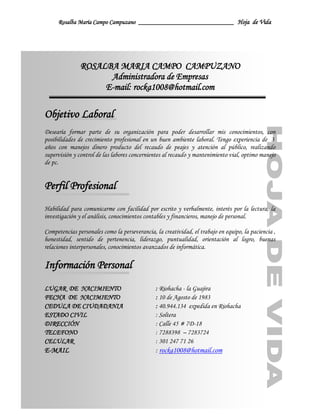 Este documento presenta el perfil profesional y la experiencia laboral de Rosalba Maria Campo Campuzano, una administradora de empresas de Riohacha, Colombia. Tiene experiencia de 3 años como supervisora de peaje y también ha trabajado como secretaria general de una fundación y como vendedora. Actualmente busca nuevas oportunidades laborales donde pueda aplicar sus conocimientos en administración, finanzas, recursos humanos y atención al cliente.