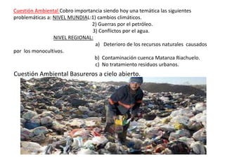 Este documento discute la importancia creciente de los temas ambientales a nivel mundial y regional, como el cambio climático, las guerras por el petróleo y la contaminación de cuencas. Explica que la degradación ambiental también conduce a la degradación social y propone un enfoque de sustentabilidad que integra las dimensiones ambiental, social, cultural y política. Finalmente, enfatiza la necesidad de formar sujetos críticos y activos en la creación de prácticas sustentables a través de debates y diseños curriculares