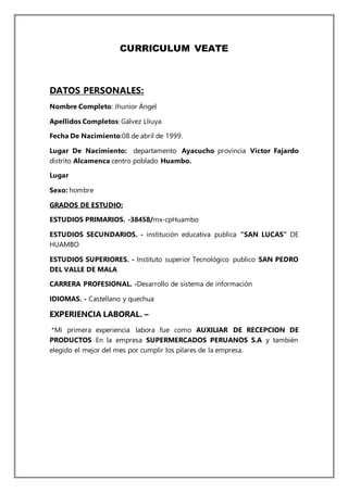 Jhunior Ángel Gálvez Lliuya nació el 8 de abril de 1999 en Huambo, Perú. Estudió primaria y secundaria en Huambo e hizo una carrera de Desarrollo de Sistemas de Información en el Instituto Superior Tecnológico Público San Pedro del Valle de Mala. Su primera experiencia laboral fue como auxiliar de recepción de productos en Supermercados Peruanos S.A., donde fue elegido el mejor del mes. En su carta de presentación, Jhunior solicita un puesto de trabajo
