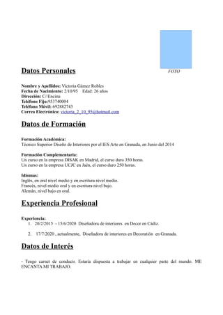 Este documento presenta los datos personales y la formación de Victoria Gámez Robles, una diseñadora de interiores de 26 años. Detalla su educación formal como Técnico Superior en Diseño de Interiores y cursos complementarios, así como su experiencia laboral de 5 años en dos empresas dedicadas a la decoración. También resume sus habilidades lingüísticas e intereses personales.
