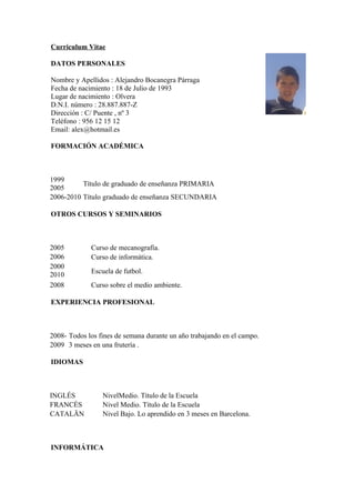 El currículum vitae resume la formación y experiencia laboral de Alejandro Bocanegra Párraga, nacido en 1993 en Olvera. Obtuvo títulos de primaria en 1999 y secundaria entre 2006-2010. Realizó cursos de mecanografía, informática, fútbol y medio ambiente. Trabajó los fines de semana en el campo durante un año y tres meses en una frutería. Domina el inglés y francés a nivel medio e informática a nivel usuario.