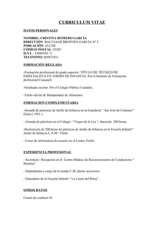 Este currículum vitae presenta los datos personales y la formación de Cristina Romero García. Obtuvo un título de técnico de especialista en jardín de infancia y es graduada escolar. Tiene experiencia como educadora en una escuela infantil y como secretaria/recepcionista en un centro médico, así como formación complementaria a través de prácticas y cursos relacionados con la educación y la informática.