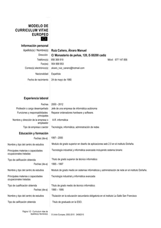 Este currículum vitae proporciona información personal y profesional de Álvaro Manuel Ruiz Cañero. Resume su experiencia laboral como jefe de una empresa de informática autónoma desde 2000 a 2012, así como su educación que incluye títulos de grado superior y medio en diseño de aplicaciones web y sistemas informáticos. También destaca sus capacidades en idiomas, habilidades sociales y técnicas avanzadas en software, hardware e informática.