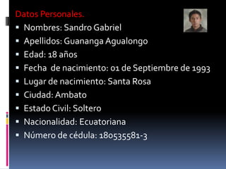 Este documento presenta el currículum vitae de Sandro Guananga, un estudiante ecuatoriano de 18 años que cursa el segundo semestre de la carrera de Ingeniería Mecánica en la Universidad Técnica de Ambato. Incluye información personal, formación académica primaria y secundaria, experiencias laborales previas en soldadura y cerrajería, y referencias personales.
