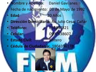 El documento presenta la información personal y académica de Daniel Gavilanes, un estudiante de 20 años de la Universidad Técnica de Ambato que cursa la especialidad de Ingeniería Mecánica. Incluye sus datos personales como nombre, fecha de nacimiento, dirección y números de contacto, así como detalles de sus estudios primarios, secundarios y superiores. Además, proporciona tres referencias personales con sus números de contacto.