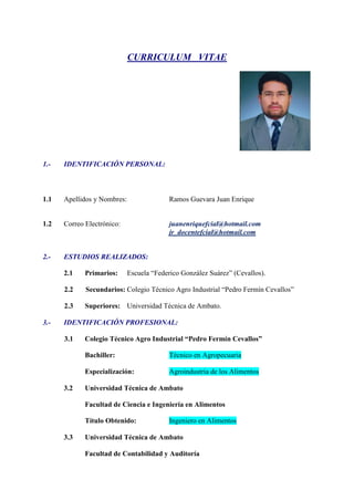 Este currículum vitae detalla la información personal, educación y experiencia laboral de Juan Enrique Ramos Guevara. Obtuvo un título de Ingeniero en Alimentos de la Universidad Técnica de Ambato y ha trabajado como docente en varias universidades. También ha dirigido tesis de pregrado sobre temas relacionados con alimentos y agricultura.