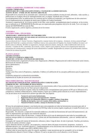 El currículum vitae resume la experiencia laboral y educación de Geraldine Grünewald. Tiene más de 20 años de experiencia en cargos gerenciales y de recursos humanos en empresas educativas y de diseño. Se ha desempeñado como directora, gerente de personal, responsable de comunicación y cuenta ejecutiva. Posee una licenciatura en relaciones públicas y varios cursos y capacitaciones en liderazgo, gestión, comunicación y resolución de conflictos.