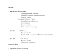 Este documento presenta el currículum vitae de Paola Nathaly Mantilla Carrera. Ella es una licenciada en inglés de 25 años de edad de Riobamba, Ecuador. Ha trabajado como profesora de inglés en varias escuelas desde 2007. También ha completado numerosos cursos y seminarios para mejorar sus habilidades de enseñanza del idioma inglés.