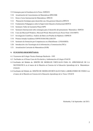 Este currículum vitae resume la información académica y profesional de Alberto Pazmiño Orozco. Incluye detalles sobre sus estudios secundarios y superiores, títulos obtenidos en ciencias de la educación y matemáticas aplicadas, y experiencia laboral de más de 15 años como profesor. También enumera los numerosos cursos y seminarios que ha completado en temas como física, matemáticas, tecnología e investigación.