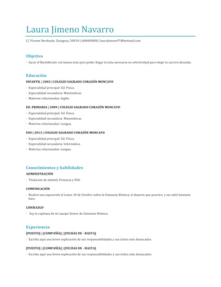 Este documento es el currículum de Laura Jimeno Navarro. Resume su educación en el Colegio Sagrado Corazón Moncayo desde la infancia hasta la ESO, con especialidades principales en Educación Física y Matemáticas. Detalla sus objetivos de sacar el Bachillerato con buena nota y lograr la nota necesaria en la selectividad. Además, enumera sus conocimientos y habilidades en administración, comunicación y liderazgo como capitana de su equipo de gimnasia rítmica.
