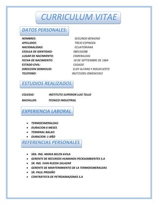 Este currículum vitae proporciona información personal y laboral de Segundo Benigno Trejo Espinoza. Detalla sus datos personales como nombre, apellidos, nacionalidad, lugar y fecha de nacimiento, así como su dirección y número de teléfono. Además, resume su educación en el Instituto Superior Luis Tello donde obtuvo un título de Técnico Industrial, y su experiencia laboral de 6 meses en Termoesmeraldas y 1 año en Terminal Balao. Finalmente, incluye 3 referencias personales.