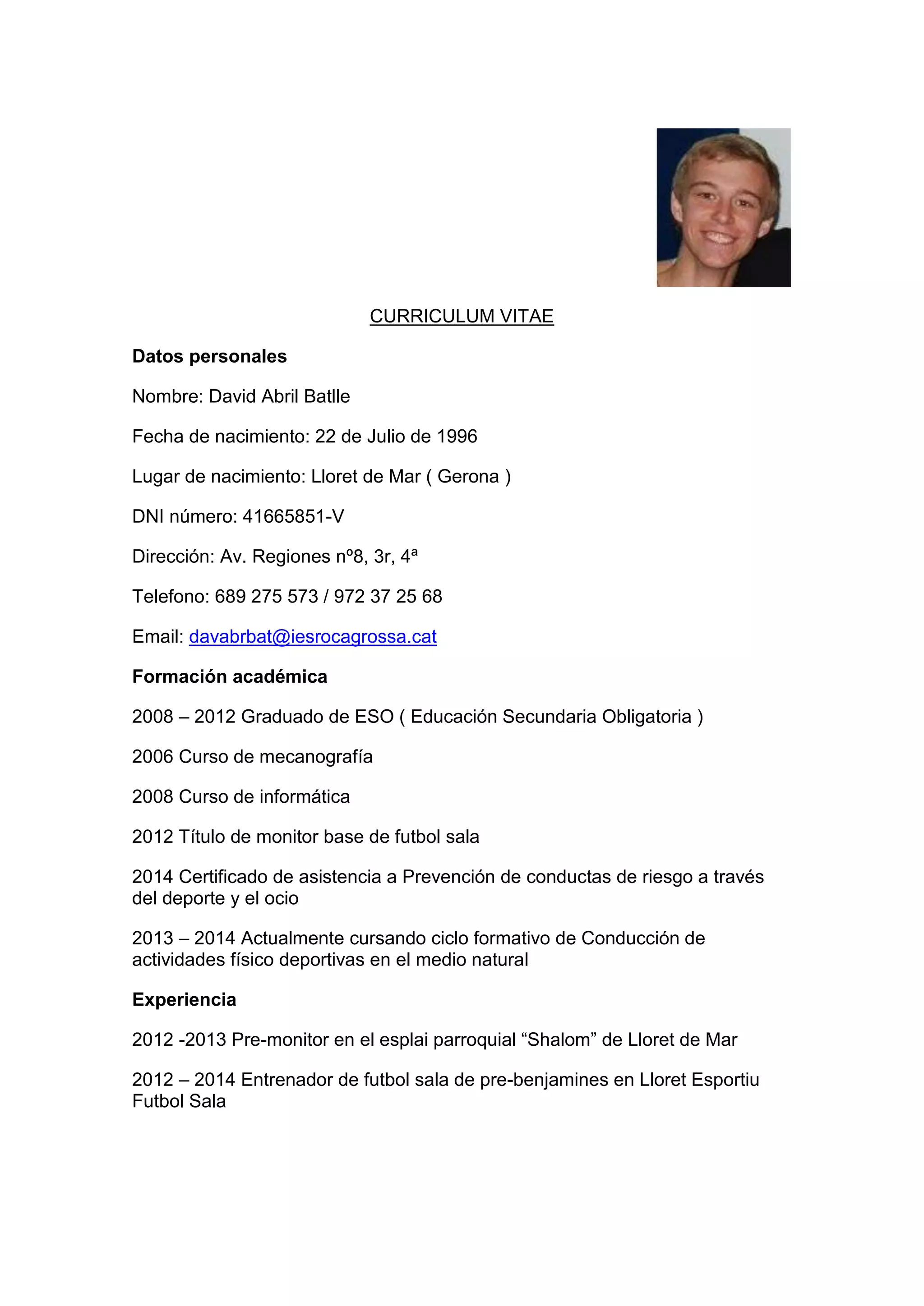 Este currículum vitae presenta los datos personales y la formación académica de David Abril Batlle, incluyendo sus estudios de ESO, cursos de mecanografía e informática, y un título de monitor de fútbol sala. También detalla su experiencia como pre-monitor en un club deportivo y entrenador de fútbol sala juvenil, así como su dominio del catalán, castellano e inglés. Actualmente cursa un ciclo formativo en actividades físicas al aire libre.