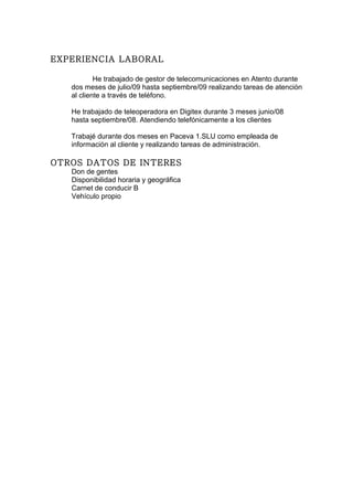 Este documento presenta los datos personales y la formación académica y laboral de Rosa de Rus Moreno. Incluye información sobre su nombre, dirección, educación formal que incluye un título técnico en administración y finanzas, cursos de formación complementaria en contabilidad, manipulación de alimentos y gestión de salarios. También detalla su experiencia laboral trabajando en atención al cliente para varias compañías y sus habilidades informáticas y de conducción.