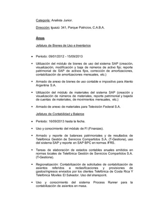 Este currículum vitae presenta a Juan Manuel Landeira, un contador público de 26 años de edad que vive en Lanús Este, Argentina. Landeira ha trabajado durante 3 años y 10 meses como analista junior en Telefónica Gestión de Servicios Compartidos, donde se ha desempeñado en las áreas de bienes de uso e inventarios y contabilidad y balance. Actualmente cursa su carrera de contador público en la Universidad de Buenos Aires con un promedio de 7,06 y busca desarrollarse profesionalmente en tareas contables.