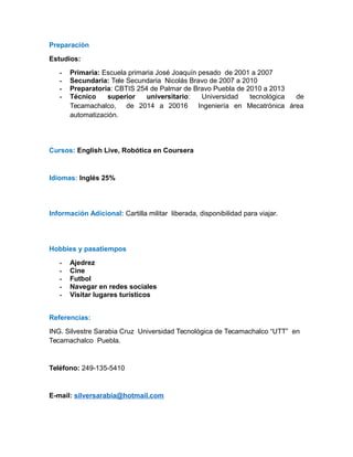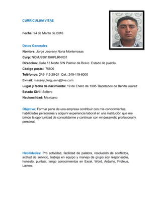 Jorge Jeovany Noria Monterrosas busca empleo como ingeniero mecánico. Nació en 1995 en Tlacotepec de Benito Juárez, Puebla. Estudió primaria, secundaria y preparatoria en Palmar de Bravo, Puebla. Obtuvo un título de Ingeniería en Mecatrónica de la Universidad Tecnológica de Tecamachalco en 2016. Posee habilidades en trabajo en equipo, resolución de conflictos y manejo de programas como Excel, Word, Arduino y Proteus.
