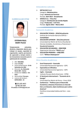El documento presenta el currículum vitae de Esteban Raul Mory Puccce, quien cuenta con experiencia laboral en empresas de metalmecánica y distribución de comida rápida, así como estudios universitarios en contabilidad, economía e inglés avanzado. También destaca sus participaciones en seminarios y conferencias sobre economía de la energía, políticas de desarrollo económico y sistemas financieros.