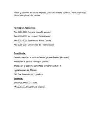 Este currículum vitae presenta los datos personales y la experiencia laboral de Ana Laura Martínez Crispín. Nació en 1987 en México, estudió la primaria, secundaria y bachillerato en escuelas locales, y se graduó de la Universidad de Tecamachalco en 2007. Ha trabajado en el Instituto Tecnológico de Puebla, el palacio municipal durante 2 años, y para el gobierno del estado desde 2010. Habla español y es adventista del séptimo día.