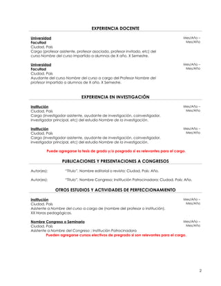 El documento proporciona un formato para un currículum vitae que incluye secciones para información personal, antecedentes académicos, resumen de habilidades, antecedentes laborales, experiencia docente, investigación, publicaciones, estudios de perfeccionamiento, otros antecedentes y referencias. El formato sugiere incluir la información más relevante y actualizada para el puesto al que se postula de manera concisa.