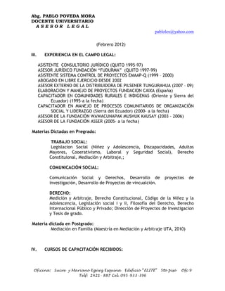 Este currículum vitae presenta los antecedentes académicos y la experiencia profesional de Pablo Poveda Mora. Poveda Mora es abogado y docente universitario con estudios de maestría. Ha trabajado como asesor legal y ha dictado cursos en derecho, trabajo social y comunicación. También ha recibido capacitación en mediación, derechos humanos y gestión institucional.