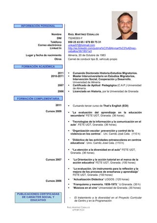 Raul Martínez Ceballos es un historiador de 38 años nacido en Almería. Actualmente es doctorando en Estudios Migratorios y ha trabajado como profesor, mediador intercultural y asesor de proyectos de cooperación. Domina programas informáticos como Excel y habla inglés a nivel conversacional.