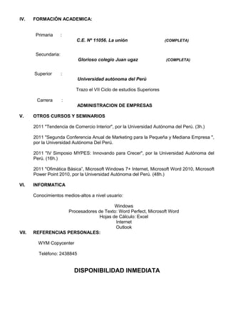 El documento presenta el currículum vitae de Elva Rozana Sánchez Flores. Detalla su información personal y de contacto, experiencia laboral previa como cajera y en atención al cliente en WYM Copycenter y Tai Loy, su formación académica en administración de empresas en la Universidad Autónoma del Perú, y cursos complementarios realizados. Adicionalmente, describe sus habilidades en informática a nivel de usuario y proporciona referencias laborales.