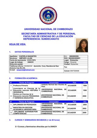 Este documento presenta la hoja de vida de Amparo Liliana Cazorla Basantes. Resume su formación académica que incluye títulos de pregrado, posgrado y diplomados. También detalla su experiencia profesional como docente en diferentes instituciones educativas, su experiencia directiva y como capacitadora. Finalmente, presenta publicaciones, idiomas y cursos recibidos.