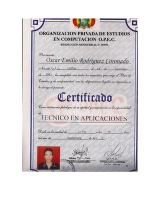El documento presenta el currículum vitae de Oscar Emilio Rodríguez Coronado. Incluye su información personal como fecha de nacimiento, dirección, teléfono y correo electrónico. En su perfil profesional, se describe a sí mismo como una persona responsable y capaz de adaptarse a distintas situaciones de trabajo, con buenas habilidades interpersonales y valores como la humildad y el servicio a la sociedad. Además, tuvo experiencia trabajando con software para el filmado y la imposición digital de placas de impresión offset.