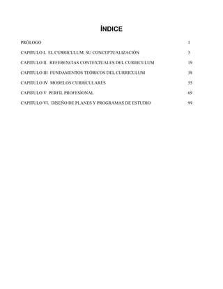 Este documento presenta un resumen del libro "Curriculum y Formación Profesional" que trata sobre la teoría y diseño curricular. El libro consta de seis capítulos que cubren temas como el concepto de currículo, referencias contextuales, fundamentos teóricos, modelos curriculares, perfil profesional y diseño de planes de estudio. El prólogo provee una introducción al contenido general del libro y su objetivo de orientar a estudiantes y profesores sobre la temática curricular.