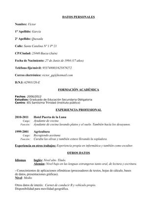 Víctor García Quesada es un hombre de 17 años nacido en 1994 en Baeza, Jaén. Actualmente vive en Santa Catalina No 1 Pa 21 en Baeza y sus datos de contacto son un teléfono fijo, móvil y correo electrónico. Terminó sus estudios de Educación Secundaria Obligatoria en el IES Santísima Trinidad en 2012. Ha trabajado como ayudante de cocina en el Hotel Puerta de la Luna desde 2010 a 2011 y recogiendo aceitunas en la agricultura desde 1999 a 2001. Domina el inglés y tiene noc