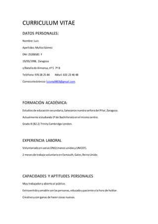 El documento presenta el currículum vitae de Luis Muñoz Gómez, un estudiante de 1o de Bachillerato de 23 años que vive en Zaragoza. Ha estudiado en el colegio Salesianos Nuestra Señora del Pilar y tiene un nivel B2.2 en inglés de Trinity Cambridge London. Ha realizado voluntariado con organizaciones como Manos Unidas y UNICEF, así como 2 meses de trabajo voluntario en Gales. Se describe a sí mismo como trabajador, extrovertido, amable, educado, paciente, creativo y con gan