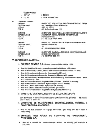 Este currículo vitae resume la información profesional y académica de Jesús Crisóstomo Galván, ingeniero mecánico. Detalla sus datos personales, experiencia laboral en cargos gerenciales en el sector eléctrico y de saneamiento, educación como ingeniero mecánico, y capacitaciones recibidas. También incluye logros laborales y cursos dictados.