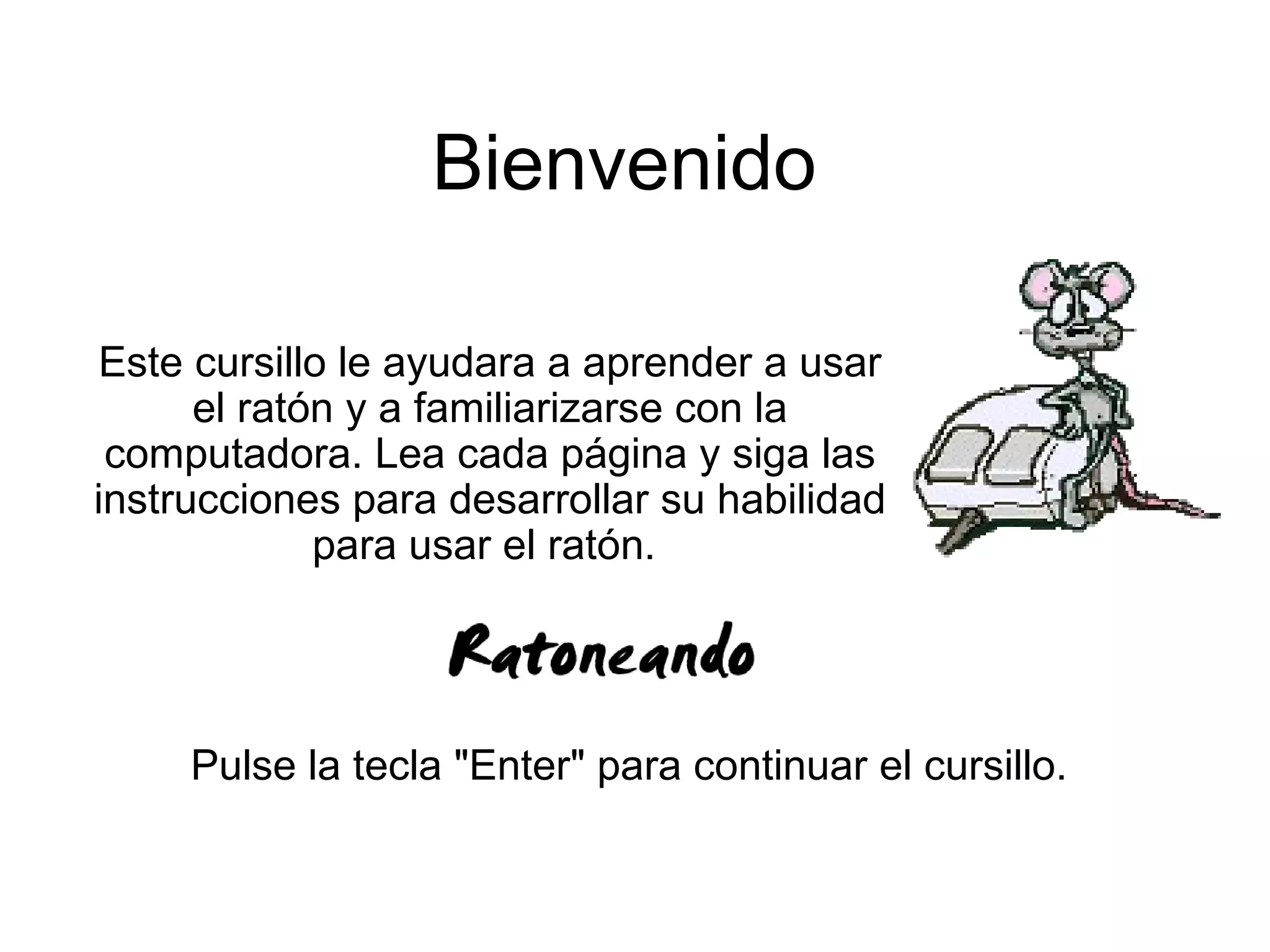 Este documento presenta las funciones básicas del ratón y proporciona instrucciones paso a paso para aprender a usarlo correctamente. Explica cómo mover el cursor en la pantalla usando el ratón, pulsar los botones izquierdo y derecho, hacer clic doble, arrastrar objetos, y aborda problemas comunes como presionar demasiado fuerte o soltar el ratón mientras se pulsa. El objetivo es desarrollar la habilidad de usar el ratón de una manera cómoda y efectiva.