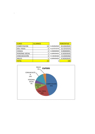 Este documento presenta estadísticas sobre la matrícula de estudiantes en diferentes cursos. Muestra que Computación tiene la mayor cantidad de estudiantes con 10 (45.5% del total) y Educación Física tiene la segunda mayor cantidad con 5 estudiantes (22.7% del total). En total, hay 22 estudiantes matriculados en 7 cursos diferentes.