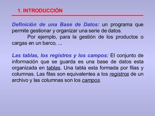 Este documento describe los conceptos básicos de Microsoft Access, incluyendo tablas, consultas, formularios e informes. Las tablas almacenan datos en registros y campos. Las consultas permiten buscar y organizar datos de las tablas. Los formularios muestran datos de varias tablas de forma amigable. Los informes generan reportes de los datos. El documento también explica cómo crear y relacionar estas estructuras de datos y el mantenimiento de bases de datos.