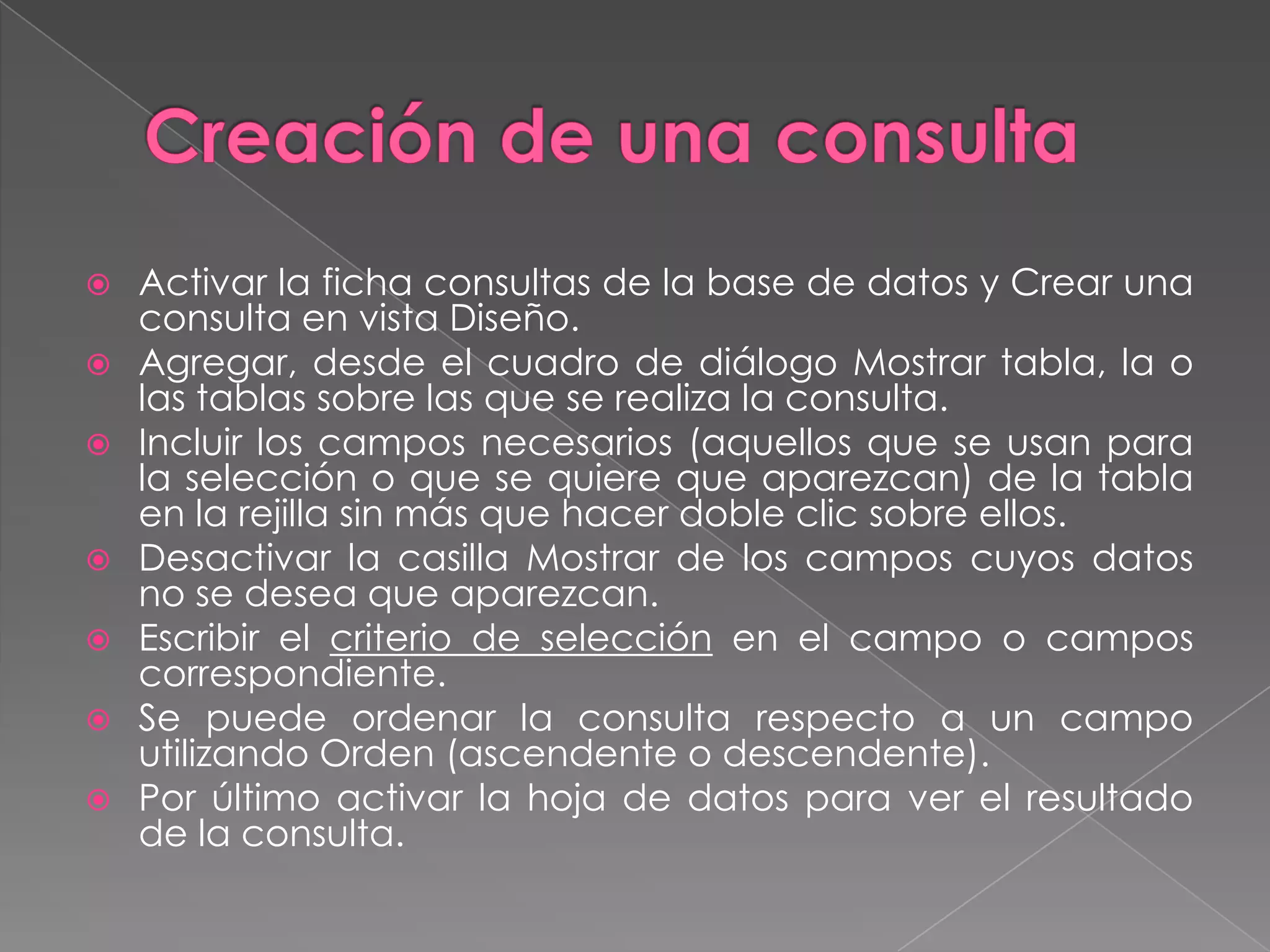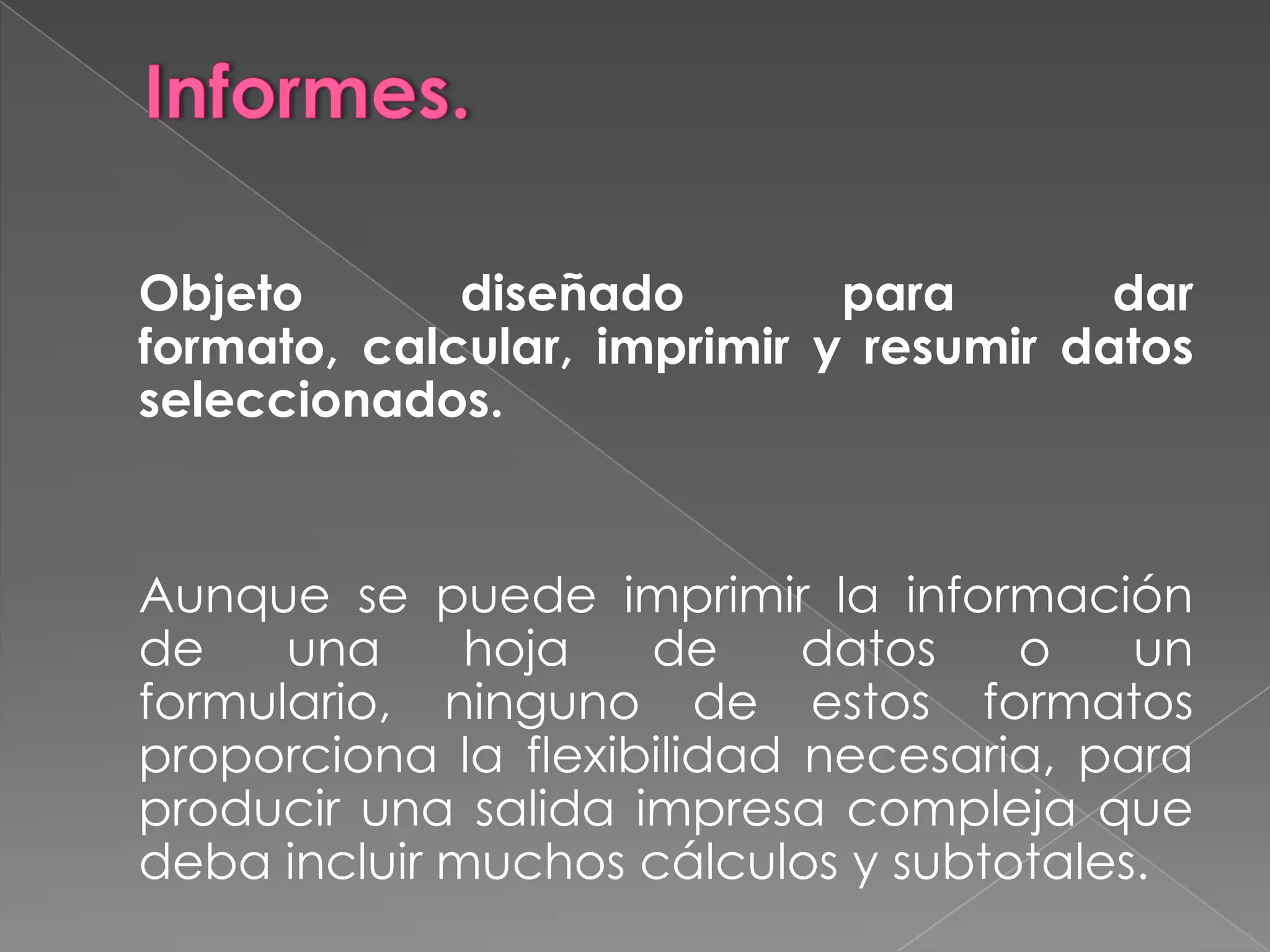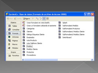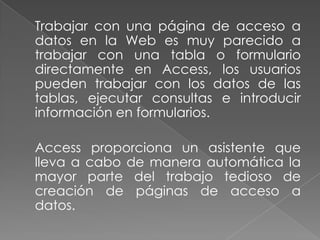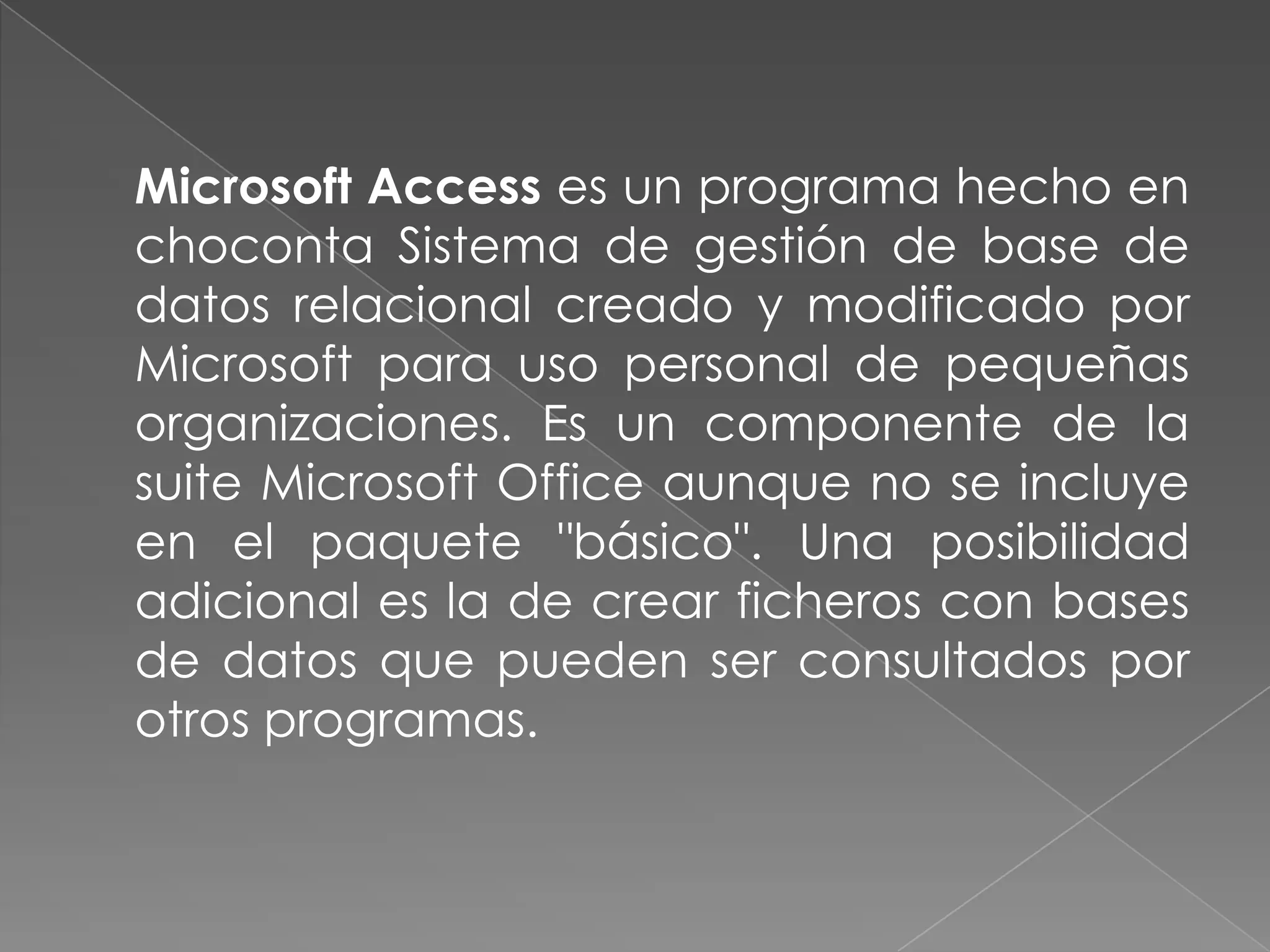 Microsoft Access es un programa de base de datos relacional creado por Microsoft para uso personal y de pequeñas organizaciones. Permite definir tablas, consultas, formularios e informes para almacenar y gestionar datos de forma efectiva. Access incluye objetos como tablas, consultas, formularios, informes, macros y módulos para definir, acceder y automatizar el uso de los datos almacenados.