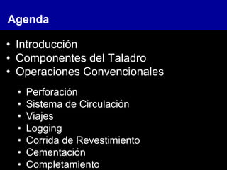 Este documento presenta una introducción al curso básico de perforación. Explica los componentes principales de un taladro de perforación e incluye una lista de las operaciones convencionales de perforación como perforación, sistema de circulación, viajes, registros, corrida de revestimiento, cementación y completamiento. También presenta la agenda del curso, que cubre temas como operaciones no convencionales, logística y control de presiones. El objetivo del curso es brindar conocimiento sobre el equipo usado en perforación y las operaciones requeridas para alcan