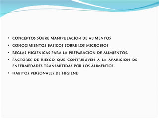 Este documento presenta un programa de inducción para manipuladores de alimentos. Cubre conceptos básicos sobre manipulación de alimentos, microbios, reglas higiénicas para preparación de alimentos y factores de riesgo para enfermedades transmitidas por alimentos. También incluye información sobre hábitos personales de higiene para manipuladores de alimentos.