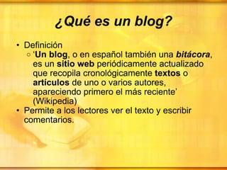 Un blog es un sitio web periódicamente actualizado que recopila cronológicamente textos o artículos de uno o varios autores. Los blogs permiten a los lectores ver el contenido y comentar. Edublogs puede usarse para que los profesores revisen el trabajo de los estudiantes y dejen comentarios, añadiendo recursos y colaborando con estudiantes y otros profesores. Los estudiantes pueden crear blogs individuales o colaborativos para proyectos de grupo, y los profesores pueden dejar comentarios.