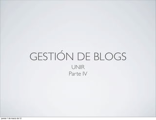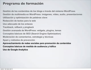 El documento proporciona una descripción detallada del programa de formación sobre gestión de blogs. Incluye temas como la gestión de contenidos y multimedia en WordPress, redacción para la web, SEO, moderación de comentarios, uso de análisis web como Google Analytics, y el aprovechamiento de redes sociales para promover blogs.