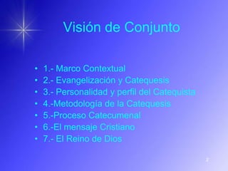 Este documento presenta una visión general de los elementos esenciales para la formación de catequistas. Explora temas como la evangelización y la catequesis, la personalidad del catequista, la metodología catequética, el proceso catecumenal, el mensaje cristiano y el Reino de Dios. También discute las razones para ser catequista desde una perspectiva pastoral y personal, y define el ministerio del catequista como una forma de servir a la Iglesia y comunicar la Palabra de Dios.