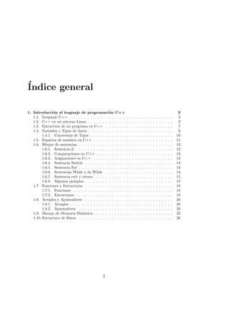 Este documento presenta un manual de programación en C++. Explica los conceptos básicos del lenguaje C++ como su estructura, variables y tipos de datos, sentencias de control de flujo como if y for, funciones, arreglos y apuntadores. También cubre temas como el manejo de memoria dinámica y estructuras de datos. El documento está dirigido a quienes desean aprender los fundamentos de la programación en C++.